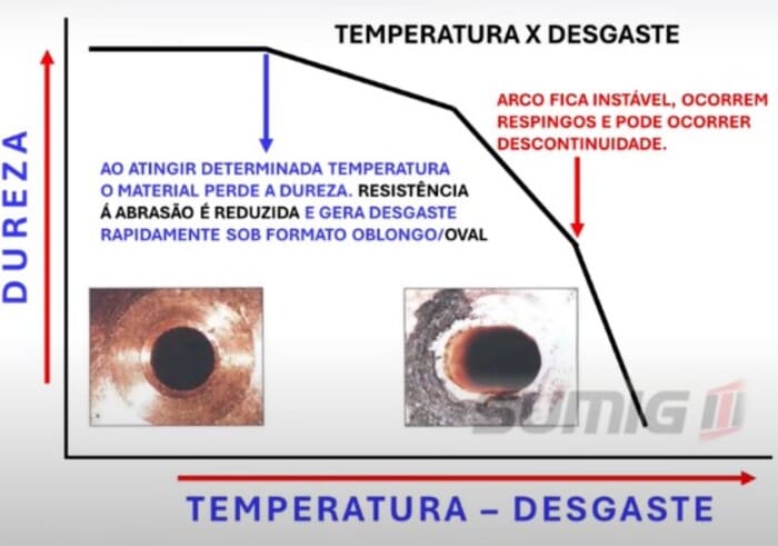 • Calor e radiação do arco elétrico: a elevada emissão de raios UV e infravermelhos aquecem o bico, acelerando o desgaste pelo seu amolecimento;