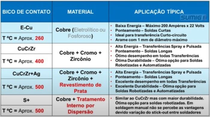 Os bicos de contato são submetidos à temperatura, que acelera o desgaste do bico. Abaixo, apresentamos uma tabela com aplicações recomendadas para cada tipo de bico, facilitando a escolha do modelo mais adequado: