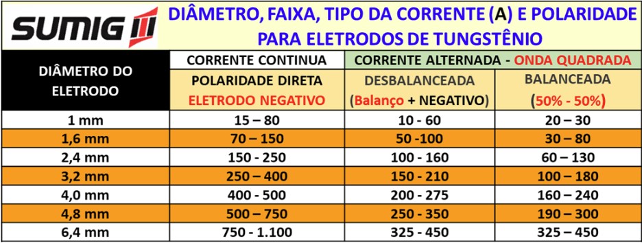 Dica: Utilize sempre o eletrodo de tungstênio com o diâmetro correto. Usar diâmetros maiores com baixa corrente pode contaminar a solda.