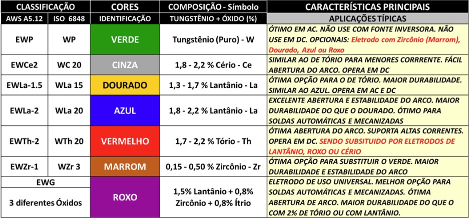Os eletrodos de ponta verde (utilizados em fontes antigas de corrente alternada) e de ponta vermelha de tório (com restrição de uso devido à radioatividade) são cada vez mais menos utilizados.