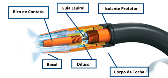 Todos os componentes têm importância na operação de soldagem, principalmente a tocha MIG/MAG