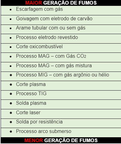 - Qual processo ou operação de soldagem ou corte gera mais ou menos fumos? A Tabela 1 pode auxiliar em saber quais os processos térmicos (solda, goivagem, corte e reparos) geram mais fumos.