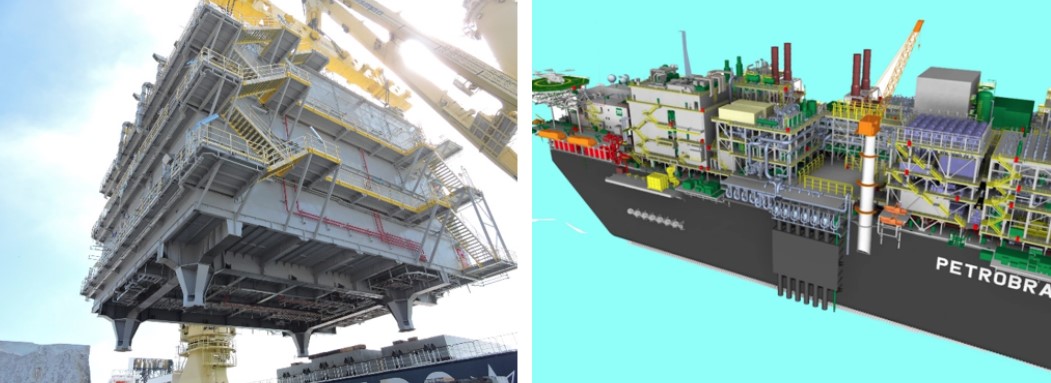 Por outro lado, uma plataforma do tipo FPSO, que extrai e armazena petróleo, ou uma sonda, que perfura o fundo marinho em busca de petróleo e possibilita a exploração, pode ter setores como os abaixo: