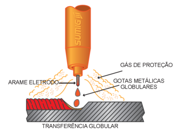 A transferência globular ocorre quando o arco elétrico transfere gotas metálicas de forma “irregular”, promovendo respingos consideráveis que aderem à superfície da junta soldada.