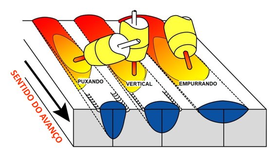 Essas posições ajudam a direcionar o arco e o metal fundido com maior controle, minimizando respingos e garantindo um cordão mais uniforme.