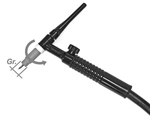 - Retire o bocal e a capa longa, aperte o corpo fixador, coloque o fixador e o eletrodo na tocha.