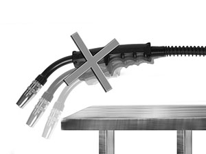 - Evitar puxões, quedas de peças pesadas, dobras em excesso e cortes sobre o cabo. Desta forma o isolamento elétrico e passagem de gás e de arame não serão comprometidos, além de evitar vazamentos de água se a tocha for refrigerada.