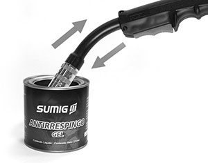 - Limpar periodicamente a ponteira, o tubo de contato e os furos do difusor de gás. Para evitar a aderência de respingos e escória recomenda-se o uso de antirrespingo Sumig em gel.