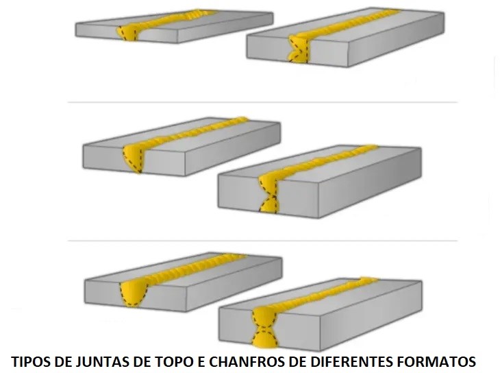 Ainda no caso do Arame Tubular com Gás, nos casos de soldas de topo, com ou sem chanfro, não se recomenda soldar EMPURRANDO. Imagem mostra diferentes Juntas de TOPO com diferentes formatos de chanfro.