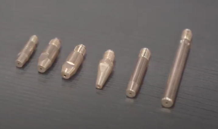 Tipos de bicos de contato – todos os bicos de contato têm funções acima mencionado e se diferenciam devido ao tipo de material e dimensões que são manufaturados. Existem alguns especialmente manufaturados para atender casos específicos.