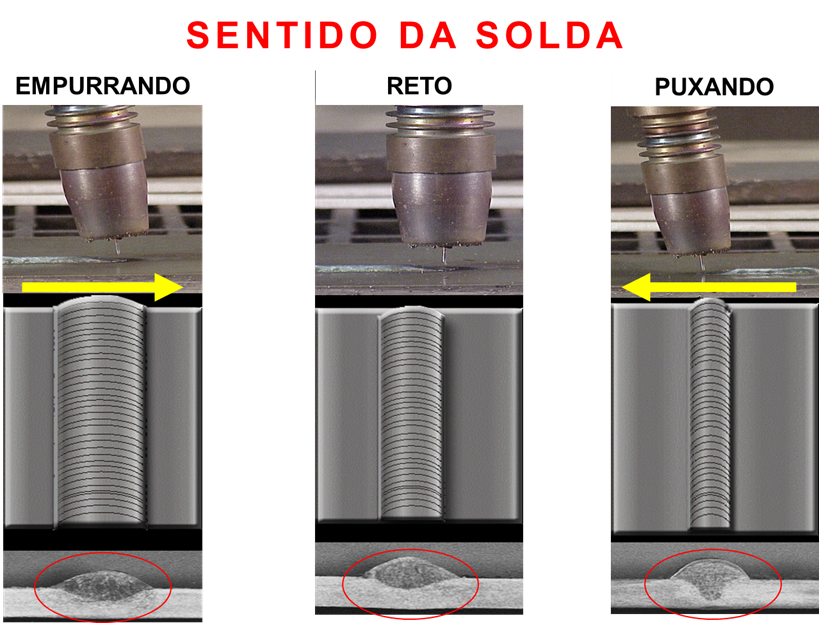Na figura que estamos mostrando (ver a seguir no texto) conseguimos identificar muito bem o resultado de cada solda feita no processo MAG nos 3 sentidos de avanço da tocha. EMPURRANDO, RETO e PUXANDO a tocha. Cada um destes sentidos terão efeitos diretamente no perfil ou dimensões da solda e também na penetração.