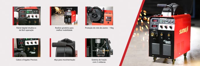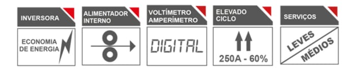 Inversora MIG/MAG, TIG e MMA (Eletrodo Revestido) com alimentador de arame interno e ciclo de trabalho de 250A - 60% e 193A - 100%, permitindo utilização de arames 0,8 a 1,0mm. Suas principais aplicações são para indústrias de forma geral, serralherias, reparo e manutenção, setor automotivo e oficinas.