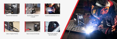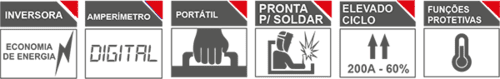 - Controle Inteligente na soldagem com EletrodoRevestido-MMA: Hot Start ou Partida Quente abertura do arco), Arc Force ou Força do Arco o arco estável para diferentes tipos de eletrodos) e Sticking ou Antiaderência aderência do eletrodo na peça);