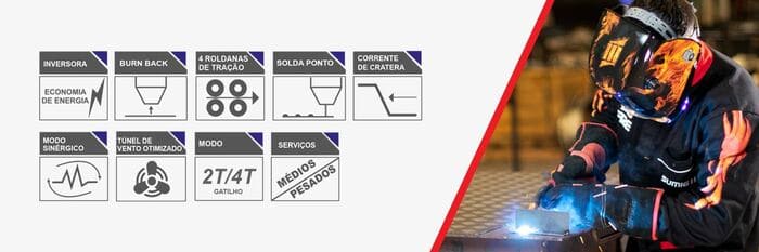 • Equipamento robusto e versátil, com excelente estabilidade de arco e baixo índice de respingos, possibilitando tanto soldas de produção quanto soldas de inspeção;