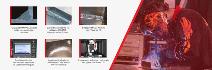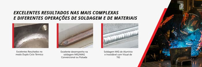 • Recurso de Duplo Ciclo Térmico executa soldas MIG/MAG com menor aporte de calor, visual similar a TIG, Soldagem de Chapas Finas de Alumínio e Inoxidável, Passe de Raiz e Chapas Galvanizadas;