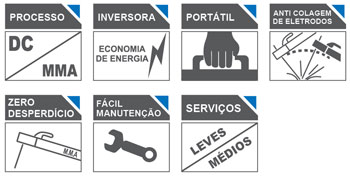 Fonte Inversora Corrente DC para soldagem MMA (Eletrodo Revestido) e TIG em Aço Carbono e inoxidáveis.