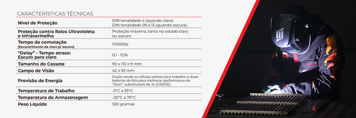 Escurecimento Automático Rápido: A lente de escurecimento automático escurece em apenas 0,01 segundo, protegendo seus olhos contra raios UV e infravermelhos nocivos.