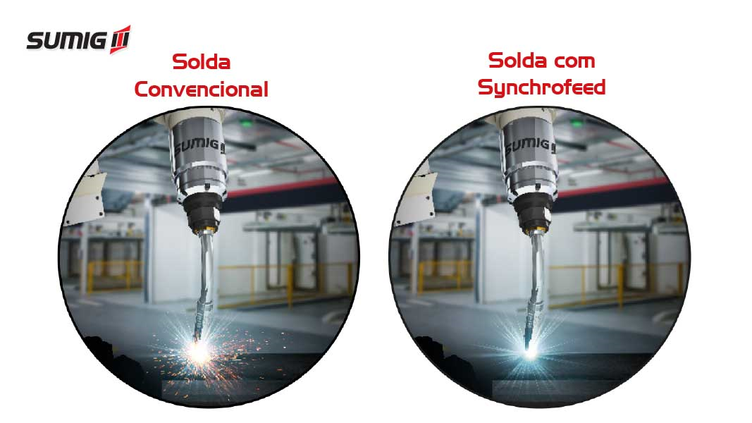 Sistema de soldagem com tecnologia de ultra-baixo respingo Synchrofeed. A sincronia entre robô, fonte de soldagem e tocha robotizada facilita e melhora o processo de soldagem.
